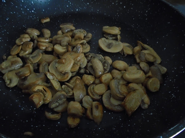 En otra sartén con una cucharada de aceite de oliva virgen extra rehogamos los champiñones laminados. Reservar.