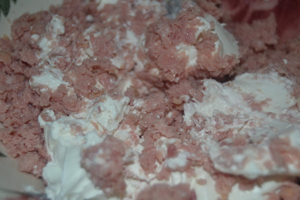 Desmenuzamos el paté con un tenedor, y le añadimos el queso de untar.