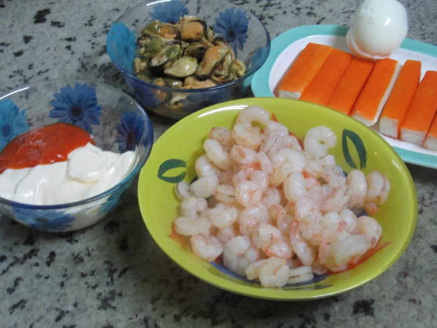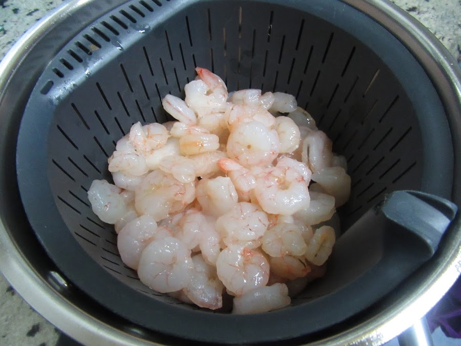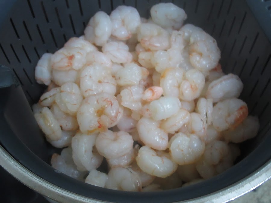1- Cocer las gambas en agua con sal , sólo 2-3 minutos, escurrir bien y dejar enfriar. Podeís hacerlas al vapor también, unos 8 minutos.