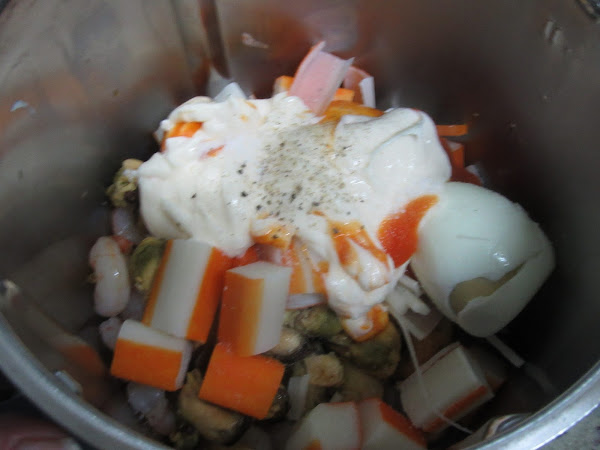 2- En el vaso del turmix o del procesador, triturar todos los ingredientes. gambas cocidas, palitos en trozos, mejillones (Al natural son menos fuertes que en escabeche, a gustos), huevo cocido, mahonesa, tomate frito, 2 pellizcos de sal y pimienta. Bajar restos, si lo queréis más fino, y volver a triturar, hasta conseguir la textura deseada.