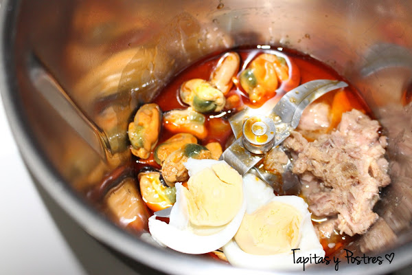 Ponemos el huevo cocido, los mejillones y el atún (reservamos el caldo) en el vaso de la thermomix o batidora y trituramos 15 segundos a velocidad 8-10 hasta que nos quede una pasta.Si la consistencia de la pasta es de nuestro agrado la dejamos tal cual, si no añadimos algo del caldo de las conservas y volvemos a triturar.