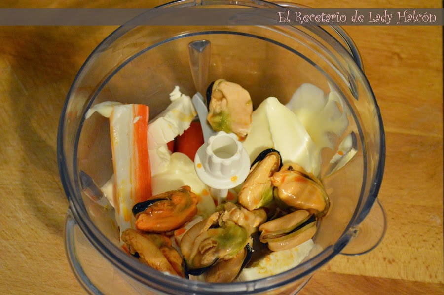 Nosotros hemos hecho una versión más sencilla y rápida a base de una buena lata de mejillones y surimi de cangrejo, pero si tenéis tiempo también podéis prepararlo con mejillones naturales hervidos y carne de cangrejo, seguro que también queda delicioso.