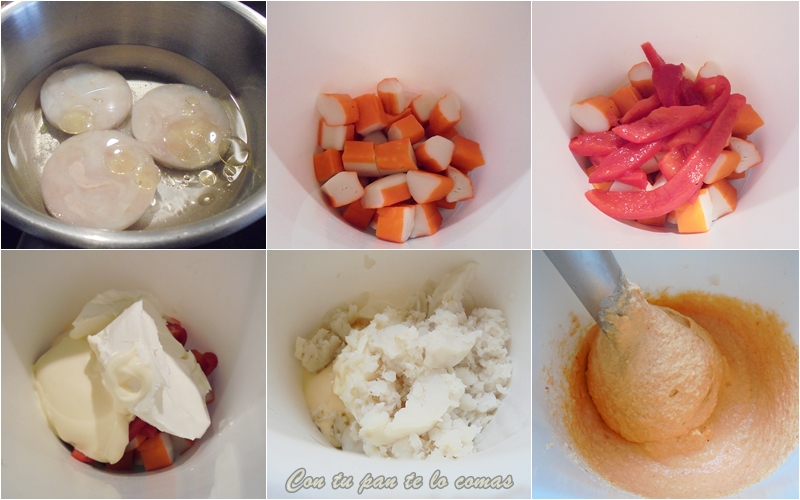 2. En el vaso de la batidora ponemos el resto de los ingredientes, los palitos y el pimiento troceados, el queso, la mayonesa y por último la merluza desmenuzada