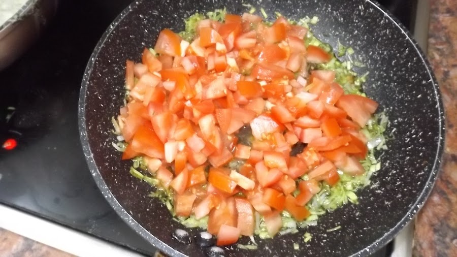 2. Añadimos los tomates a cuadros salpimentamos y rehogamos unos 7 minutos moviendo de vez en cuando.
