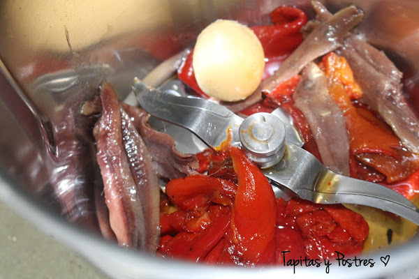 Ponemos en el vaso de la thermomix el pimiento asado, las anchoas con el aceite y la yema de huevo cocido y trituramos 15 segundos a velocidad 8-10. Hacemos esto varias veces hasta que obtengamos una crema homogénea, puede que nos queden tropezones de anchoas, pero si son pequeños los dejamos.