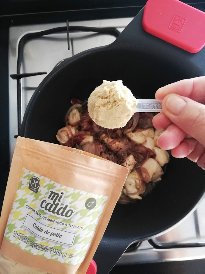 3. Añadiremos los higaditos y la pechuga de pollo y dejaremos unos minutos para que se doren un poco.