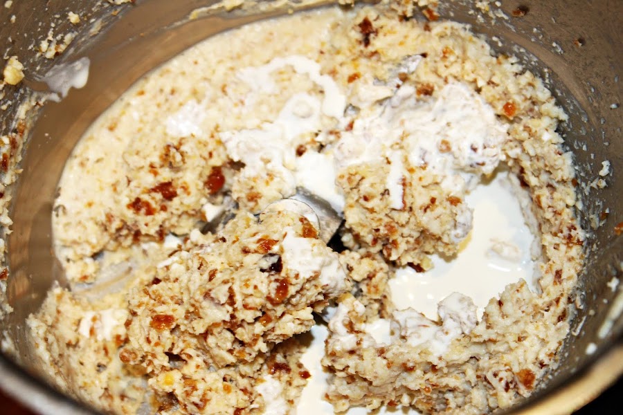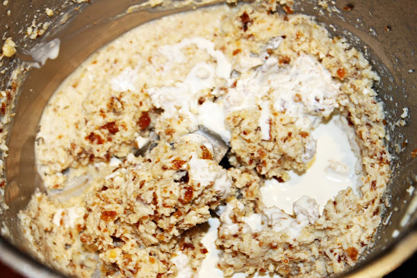 Añade al vaso del Thermomix las nueces peladas, las pasas hidratadas, los higos, los tallos de cebollino, el queso brie y la nata (crema de leche).