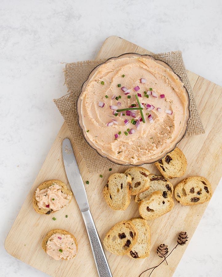 Ya lo puedes servir a modo de paté untado en unas tostadas. Decora con un poco cebollino o cebolla roja y sirve.