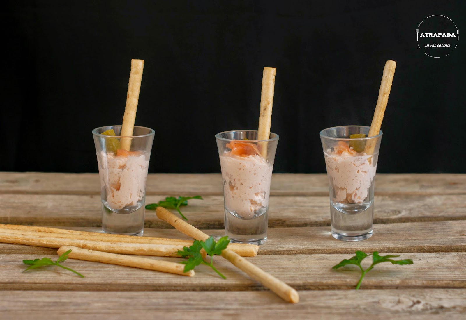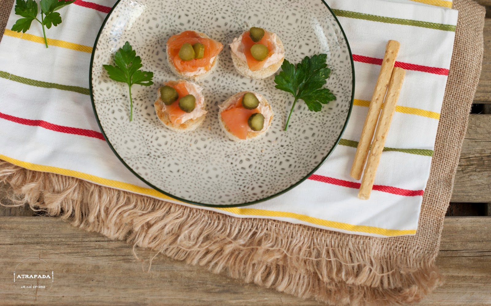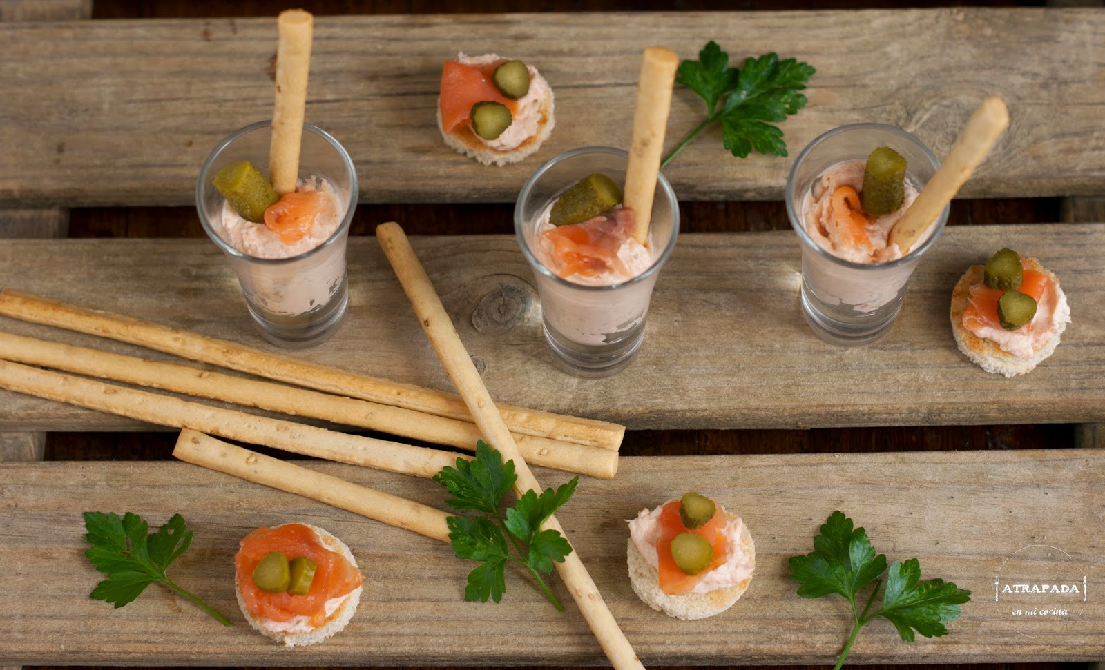 Cortamos, con la ayuda de un cortapastas, cículos de pan de molde (podéis darle forma de estrella, cuadrada, de corazón....como más os guste) y tostamos en el tostador. Podemos dejar para que cada comensal se unte su tostada, dejando al lado el salmón y las rebanadas de pepinillos en vinagre. O podemos montarlo directamente nosotros. En caso de servirlo en vasitos los rellenaremos al preparar el paté y decoramos a la hora de servirlos, acompañados de unos grisines.