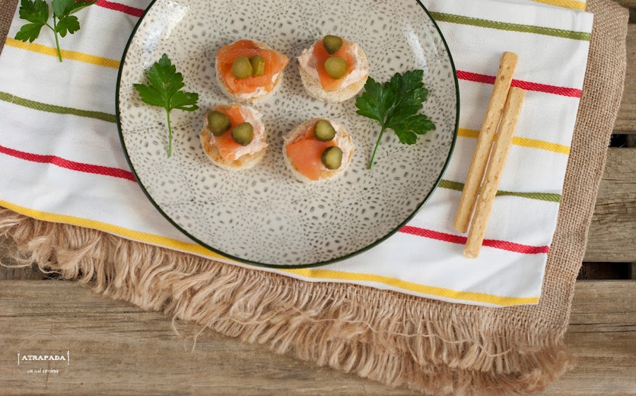 Último domingo del año y volvemos con el reto del asalta blogs, esta vez con su versión del asaltador invisible. Hasta hoy no se desvelan los misterios, y no sabremos quién nos ha asaltado la cocina. Por mi parte he ido a asaltar la cocina de La Dolce Gula, y he estado un poco remolona todo el mes, por lo que hasta última hora no me decanté por una receta concreta. Ha sido fácil elegir después de mucho tiempo, puesto que al final ha caído una receta facilísima y además que viene de lujo para las fiestas navideñas, y si no ahora veréis....se trata de un paté de salmón ahumado. La receta es genial, el paté solo está estupendo y si le ponemos un poco de salmón ahumado por encima y pepinillos queda genial. Lo he presentado también de las misma forma, en círculos de pan de molde tostados y también vasitos pequeños para servirlos individuales.