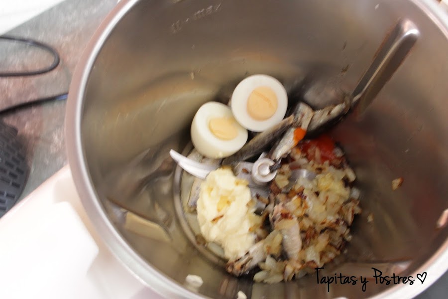 Vamos a pochar primero la cebolla cortada a cuadraditos. Luego ponemos en el vaso de la thermomix o de la batidora las sardinillas de las dos latas sin el aceite, el huevo cocido, la mayonesa y el tomate y la cebolla sofrita. Trituramos 15 segundos a velocidad 6, bajamos los restos que se quedan en las paredes del vaso y volvemos a triturar. Hacemos esto, las veces que sea necesario para que nos quede una crema homogénea.