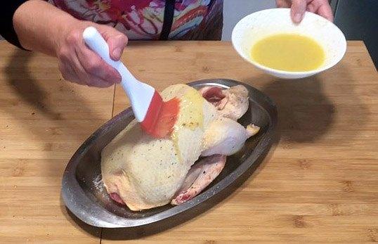 Derretimos la mantequilla en el microondas y agregamos los cubitos de caldo desmenuzados. Con esta mezcla pintaremos por dentro y fuera todo el pato.