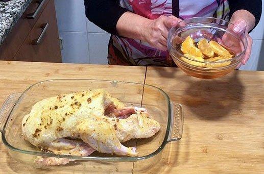 Introduciremos los gajos de naranja dentro del pato y regaremos el pato con todo el brandy.