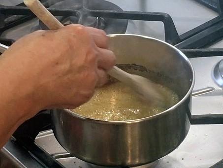 Preparamos un caramelo con el azúcar y un poquito de agua. Hay que remover todo el rato, con el fuego bajo y cuando empiece a dorarse el azúcar, sin que se queme, añadimos el vinagre poco a poco ya que puede salpicarnos. Coceremos durante unos dos minutos con el fuego muy bajo.