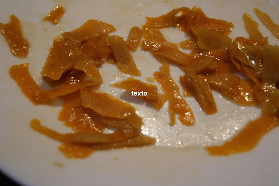 Separamos la piel del limón y de la naranja, cortamos en tiras la de la naranja y reservamos; no usamos las de limón.