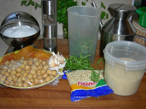 La salsa pesto es muy fácil, ponemos en un bol para la batidora la rucula, un pellizco de sal y de pimienta, el diente de ajo, los piñones, y un poco de aceite y trituramos añadiremos mas aceite según nos guste la salsa.