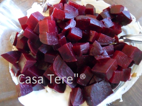 Por ultimo picar la remolacha en cubitos pequeños y revolver con el aliño.