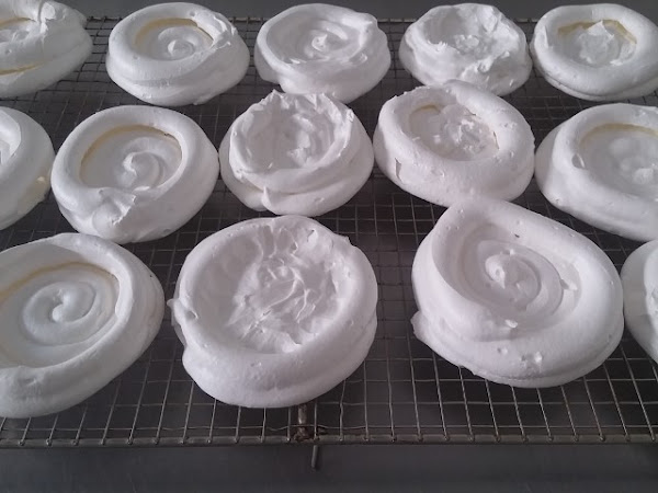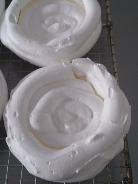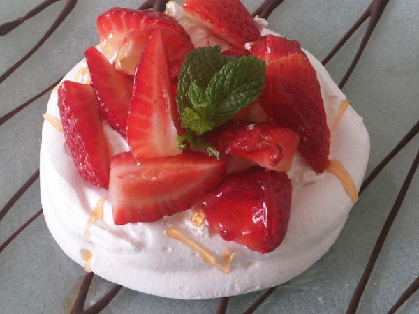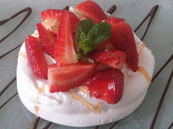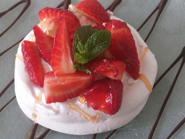 Preparación: Poner las claras, a temperatura ambiente, con el crémor tártaro en el bol de la batidora y montar con el accesorio de varillas. Cuando estén firmes añadir el azúcar granillo. Unos minutos después agregar en dos veces el azúcar glas mezclado con el almidón de maíz (Maizena) y seguir batiendo hasta que esté bien firme. Preparar una bandeja de horno con papel y hacer unos círculos del tamaño que se desee, según se vayan a hacer individuales o no. Yo las he hecho individuales. Dar la vuelta al para que el dibujo quede por el otro lado y la tinta o lápiz no pasen al alimento. Colocar el merengue, yo lo he hecho con manga pastelera y hornear a 100 º C durante una hora y media o dos horas. Dejar enfriar totalmente por lo que es mejor montar las Paulovas al día siguiente. Limpiar las fresas, trocear o no según tamaño o gustos y reservar. Montar la nata (crema de leche) que deberá esta bien fría y cuando esté a medio montar añadir el azúcar glas. Terminar de montar, teniendo mucho cuidado porque se corta rápidamente. Una vez montada la nata (crema de leche) guarnecer las Paulovas con ella y con las fresas. Decorar cada una con unas hojitas de menta y servir.