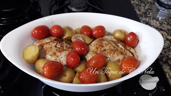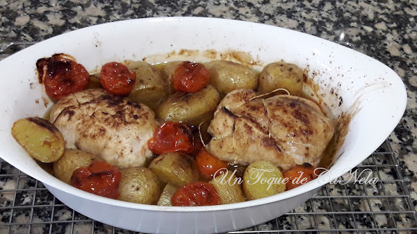 En dos sartenes, se pone un poco de mantequilla y aceite y se pasan, en una los cherry y en la otra, las patatas con piel. Unos 5/7 minutos. Se ponen en la fuente con el pollo.