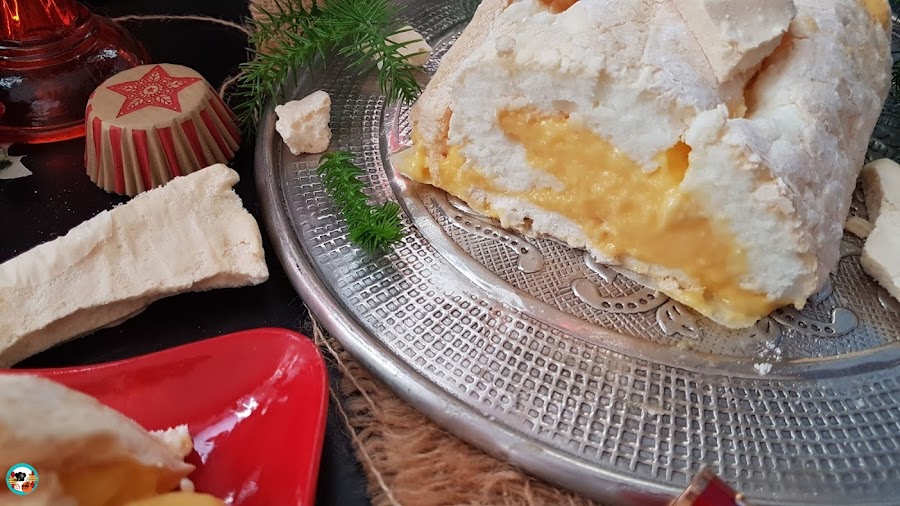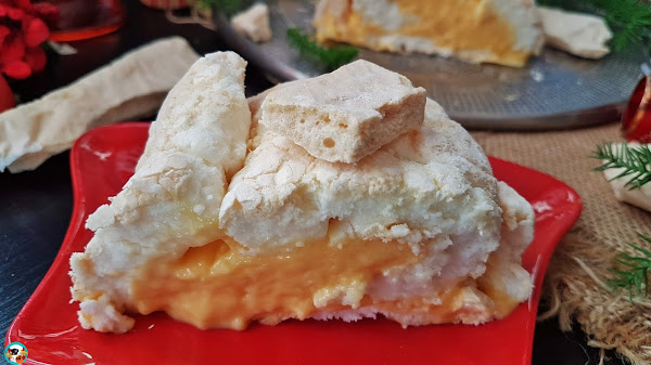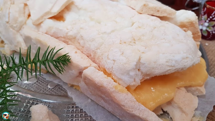 Pavlova con crema de yema, elaboración:1.-Preparamos el merengue: Batimos las claras con el vinagre y el zumo de limón. Añadimos el azúcar de a poco, batimos hasta conseguir un merengue liso y brillante. Una vez este el merengue hecho añadimos la maicena y la mezclamos con movimientos envolvente. Cubrimos una placa de horno con papel sulfurizado (papel de horno) Disponemos encina el merengue, extendemos con una espátula el merengue por toda la placa de forma uniforme.