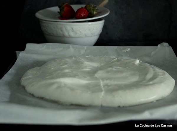 La noche anterior, monta las claras a punto de nieve junto con la sal, cuando empiecen a burbujear añades poco a poco, el azúcar que has tamizado con la maizena. Cuando estén duras, añade el vinagre. Extiende en fuente de horno cubierta con papel vegetal, forma un círculo o dos, como más te guste, intentando dejar un hueco en el medio.