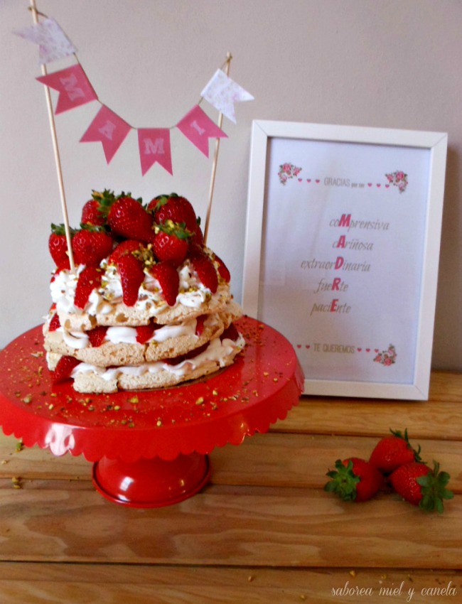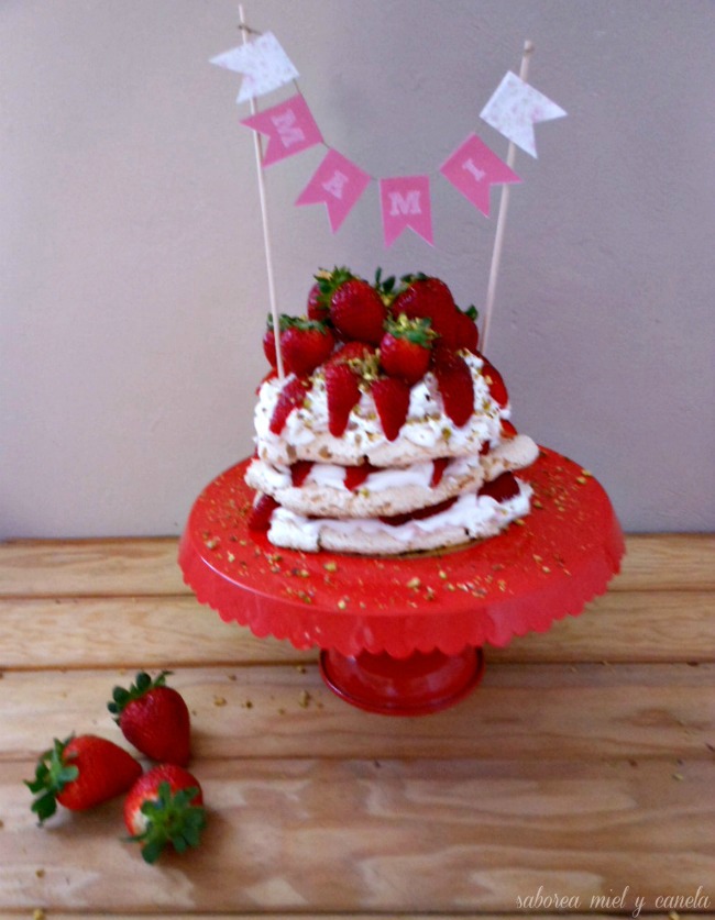 Hoy toca una receta, concretamente un delicioso pastel de merengue, fresas y pistachos perfecto para celebrar ese día tan especial. Es muy fácil de preparar, pero a grosso modo, la clave para hacer un buen merengue es que las claras estén a temperatura ambiente y para hacer nata montada (crema de leche) es que ésta esté bien fría, incluso el bol donde vayamos a batir, ponerlo un ratito en el congelador. También es importante que la nata (crema de leche) sea de buena calidad, para mí, la mejor marca es la ERMOL, aquí puedes ver un post donde hablo de ella. Si no puedes conseguirla, utiliza una de buena marca para evitar que se corte.
