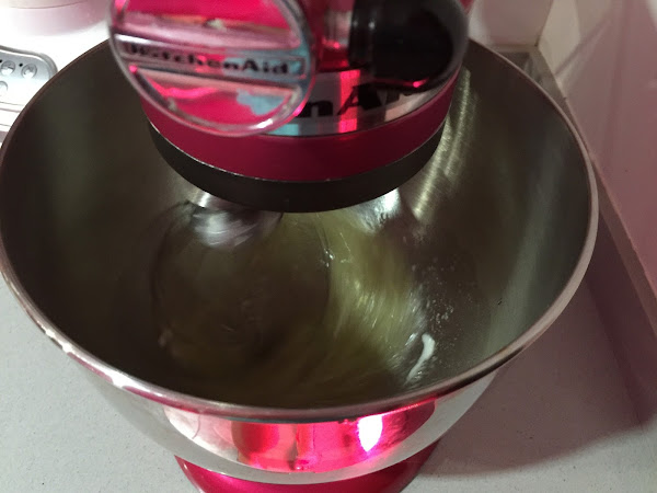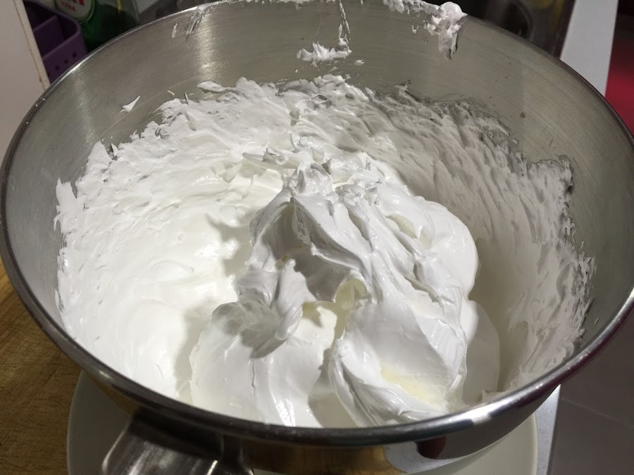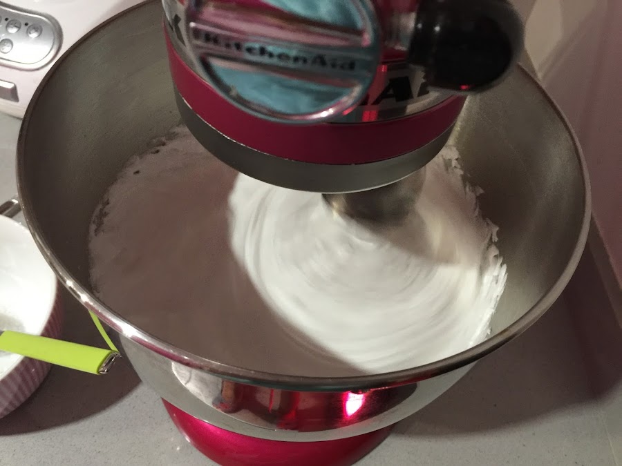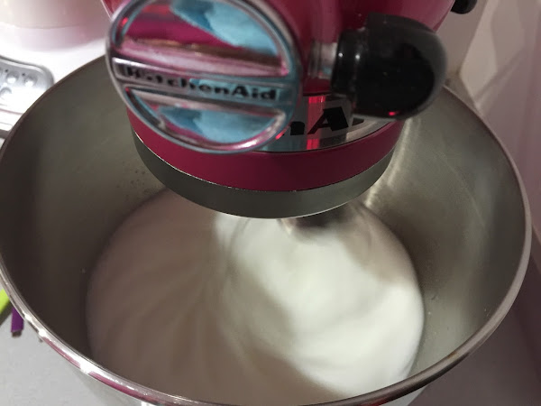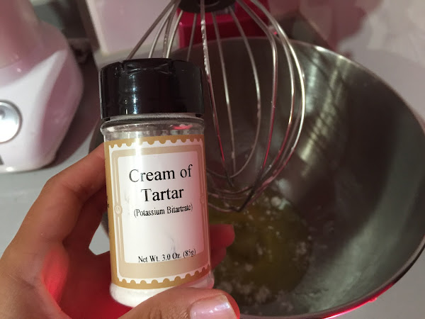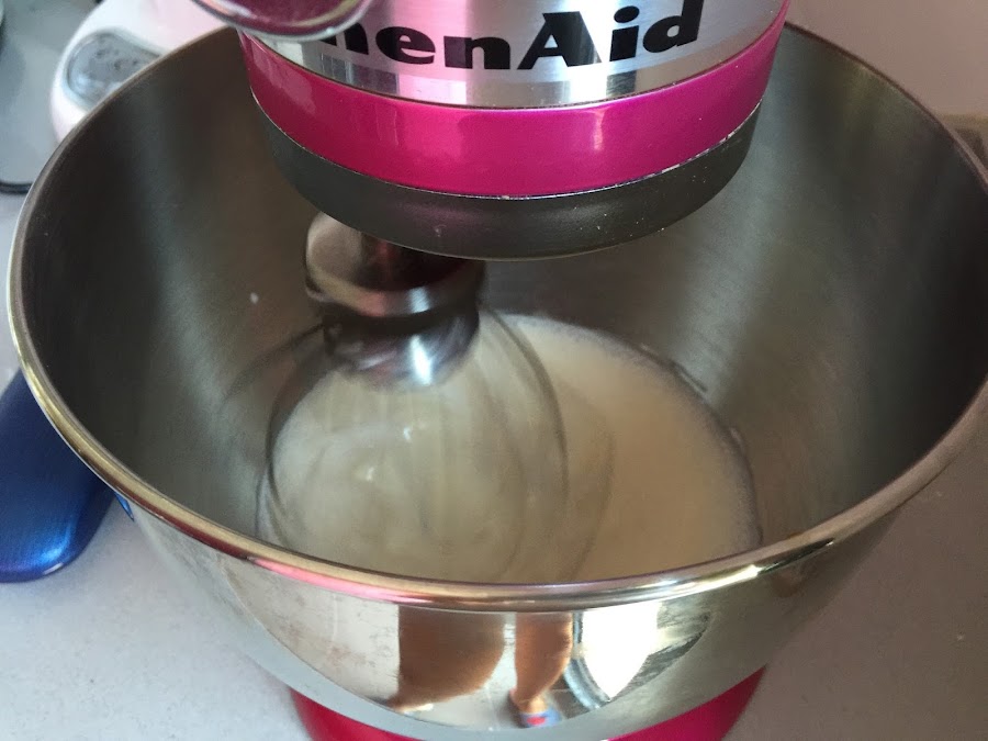 2. Ponemos las claras en la bol de la KA y añadimos el 1/4 de cucharadita de cremor tártaro. Batimos hasta integrar por completo. Seguimos batiendo a velocidad alta hasta que las claras monten y empiecen a formar picos.