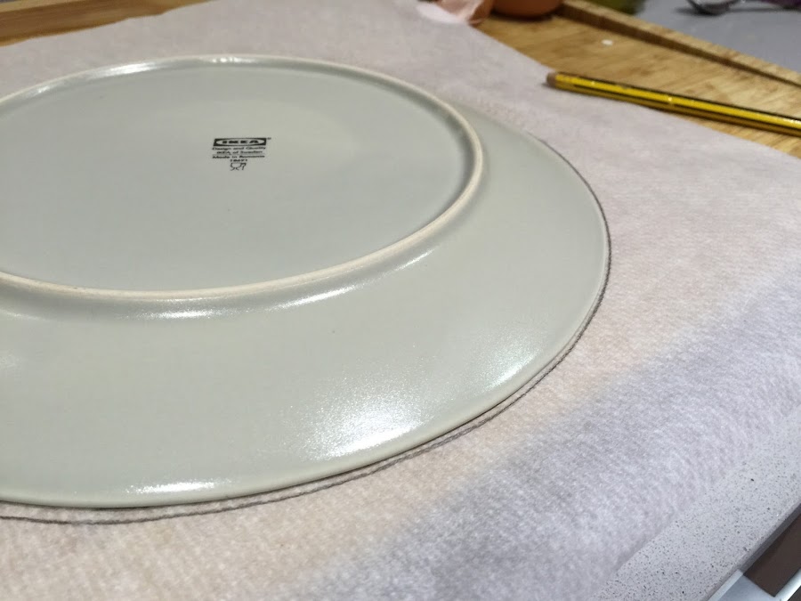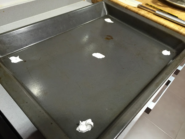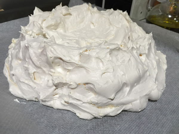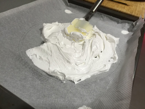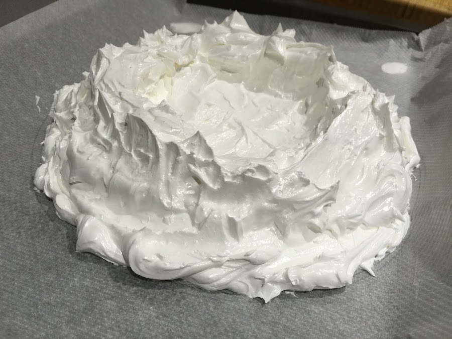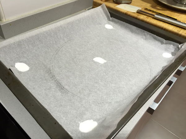 5. Sobre el papel de horno dibujamos el contorno redondo de un plato. Damos la vuelta al papel y esta será nuestra referencia para extender el merengue y que quede completamente redondo. Colocamos sobre la bandeja de horno 5 pegotitos de merengue y sobre ella el papel de horno, recordar poner el lápiz cara abajo. Con estos pegotitos de merengue el papel no se moverá nada. Con ayuda de una espátula extendemos el merengue ocupando todo el círculo. Le damos forma de nido para poder rellenar después.