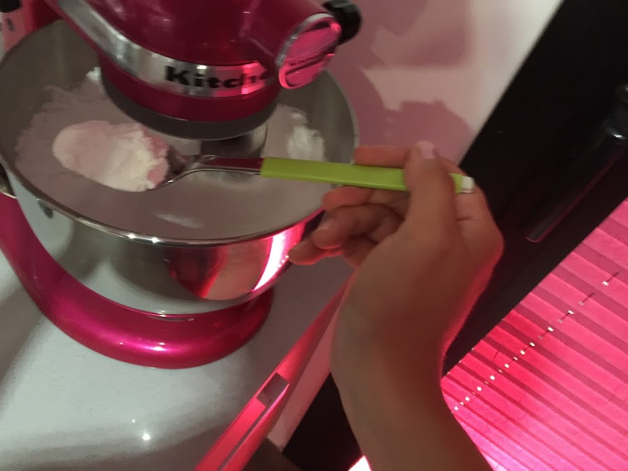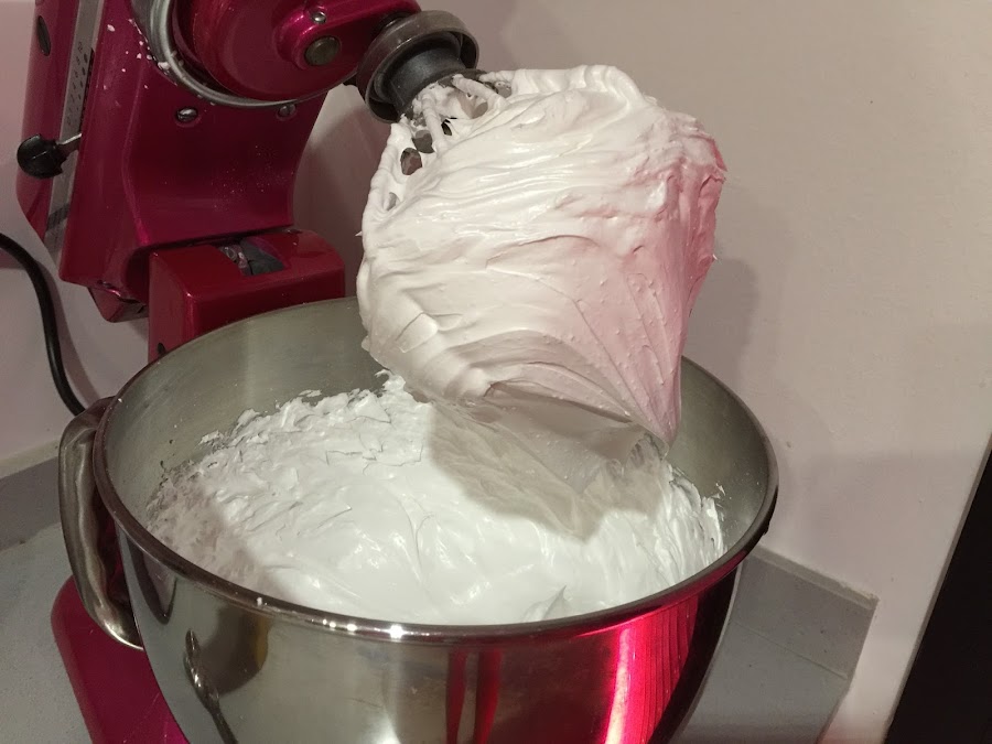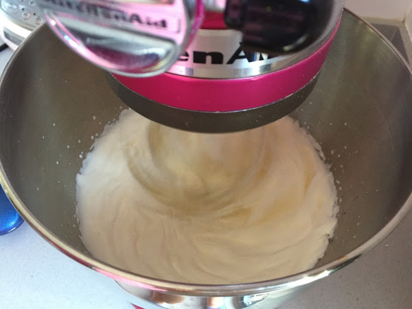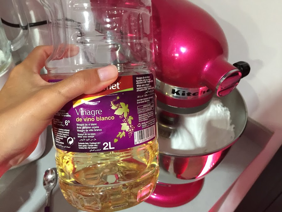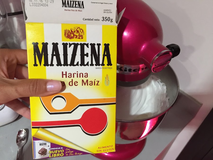 4. Cuando el azúcar este totalmente integrado añadimos una cucharada de maizena mientras seguimos batiendo y por último una cucharadita de vinagre de vino blanco.