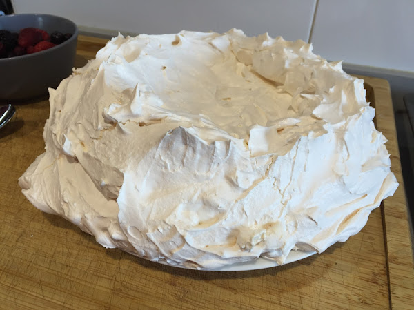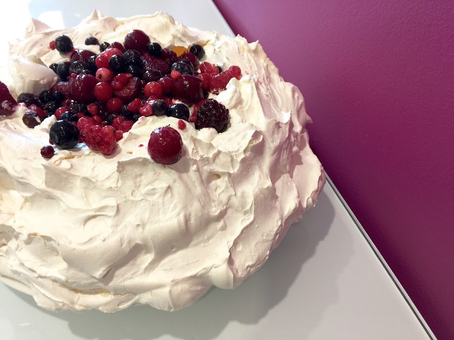 Colocamos los frutos rojos por encima y servimos enseguida. La nata (crema de leche) humedece el merengue así que debemos rellenarlo justo antes de servir.