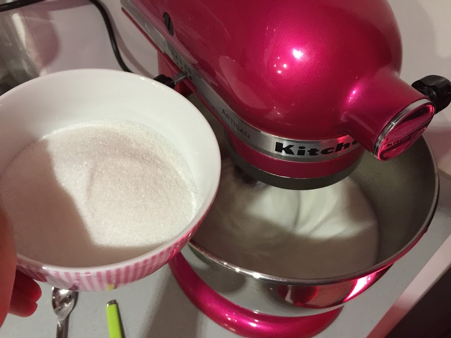 3. Añadimos el azúcar de cucharada en cucharada, los 300g, a ritmo lento, para dar tiempo a que el azúcar se disuelva. Este proceso debe llevarnos unos 10 minutos.