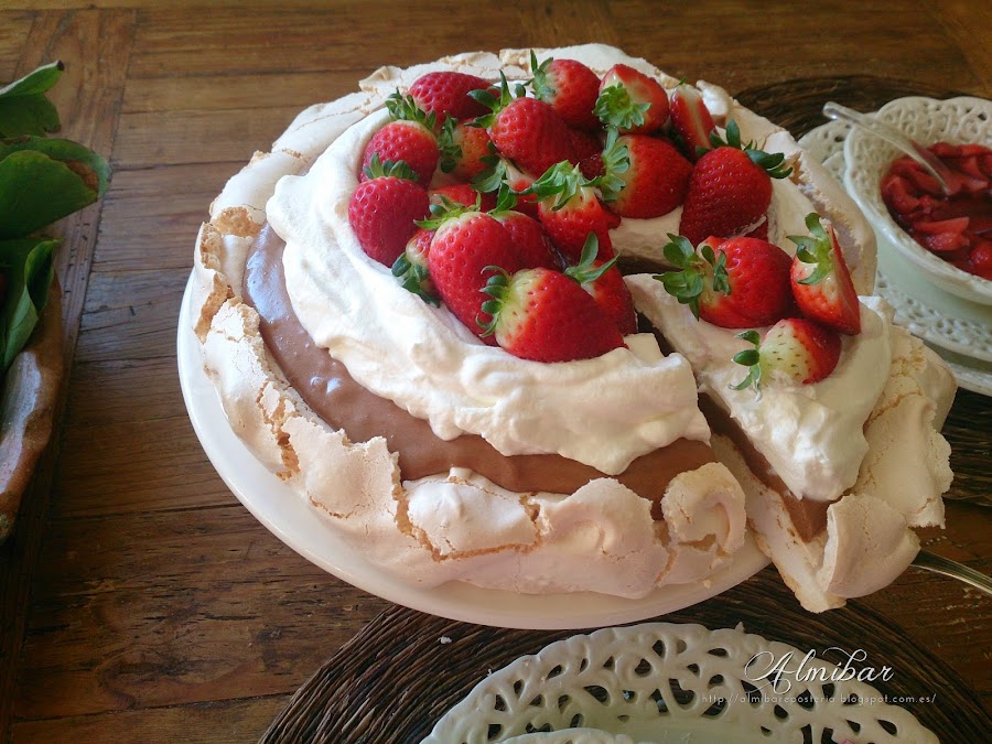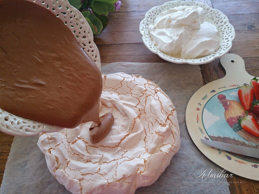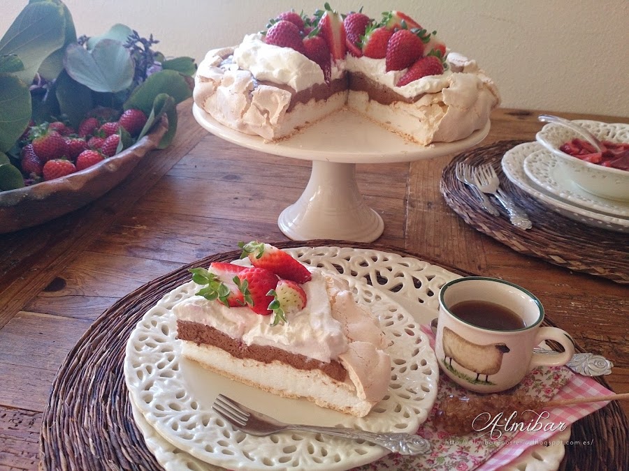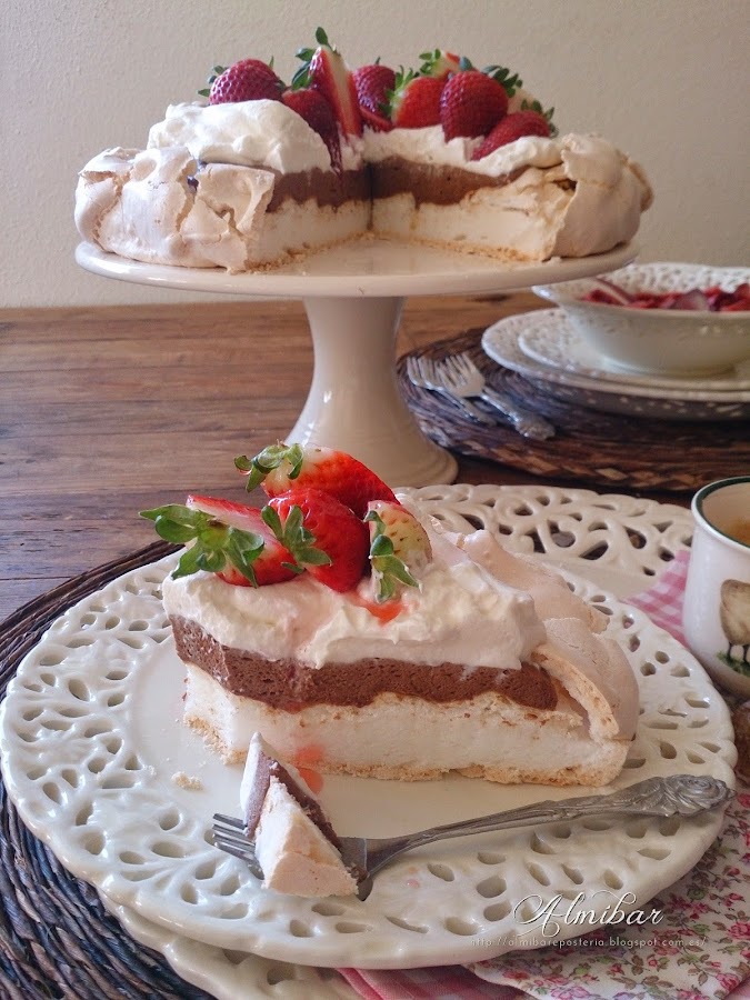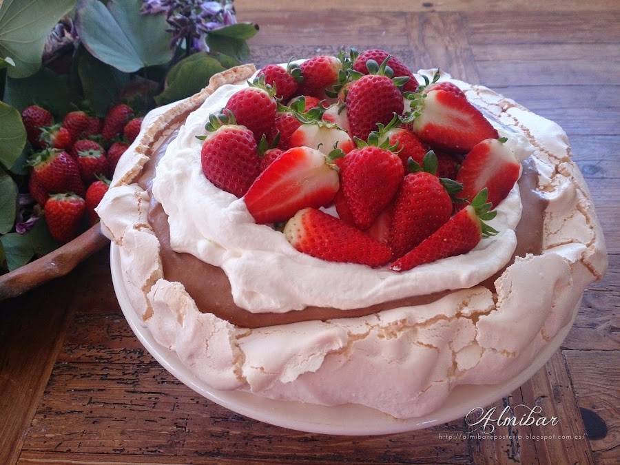 ...Pavlova con mousse de chocolate, nata (crema de leche) y fresas...
