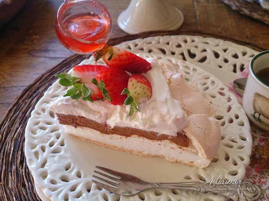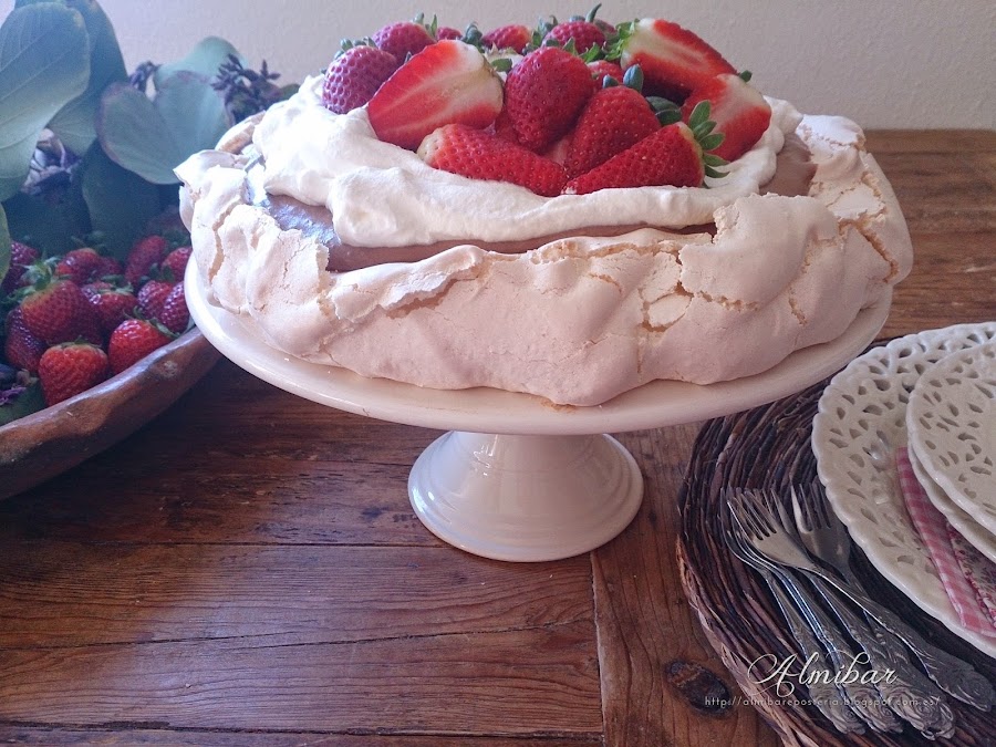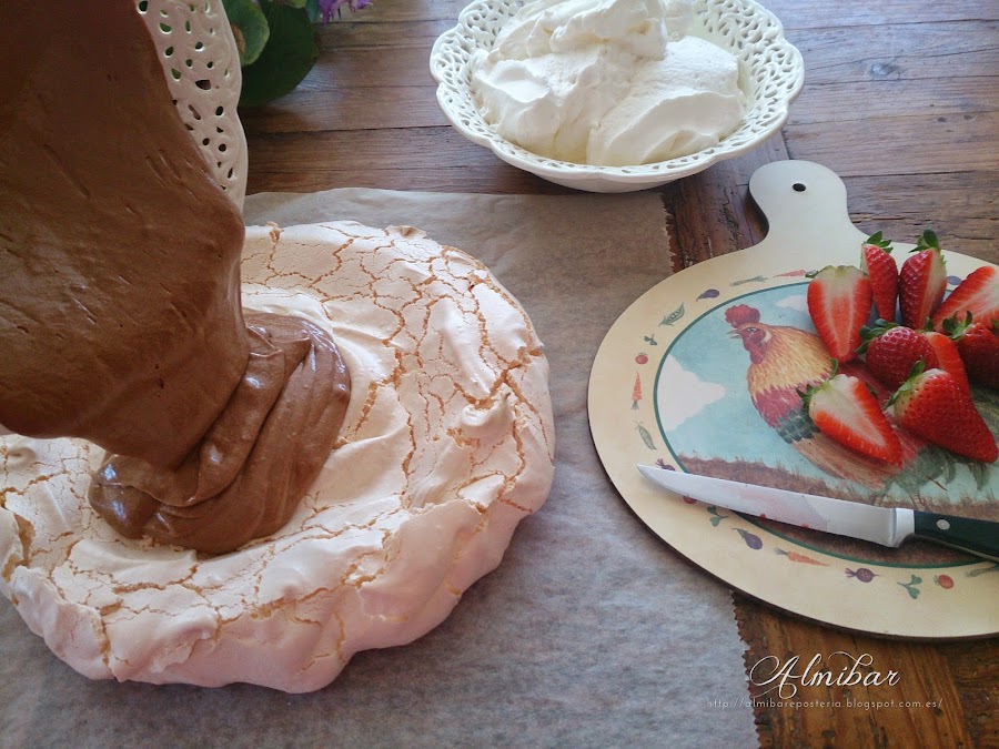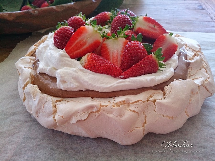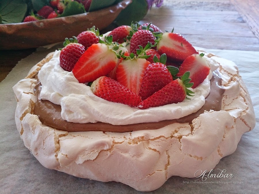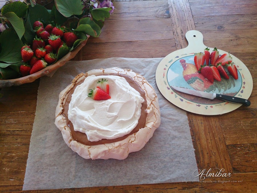 ...Pavlova con mousse de chocolate, nata (crema de leche) y fresas...