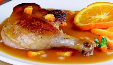 Decorar con rodajas de naranja natural, o pasada por la plancha y dorada.