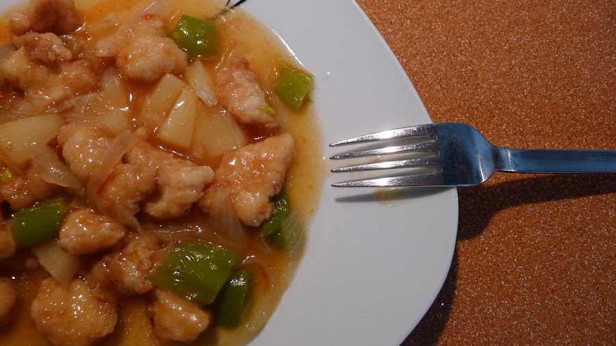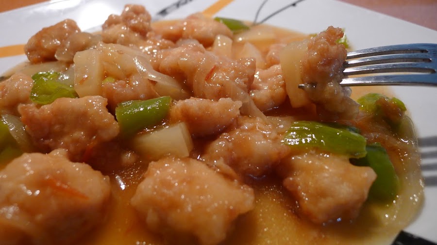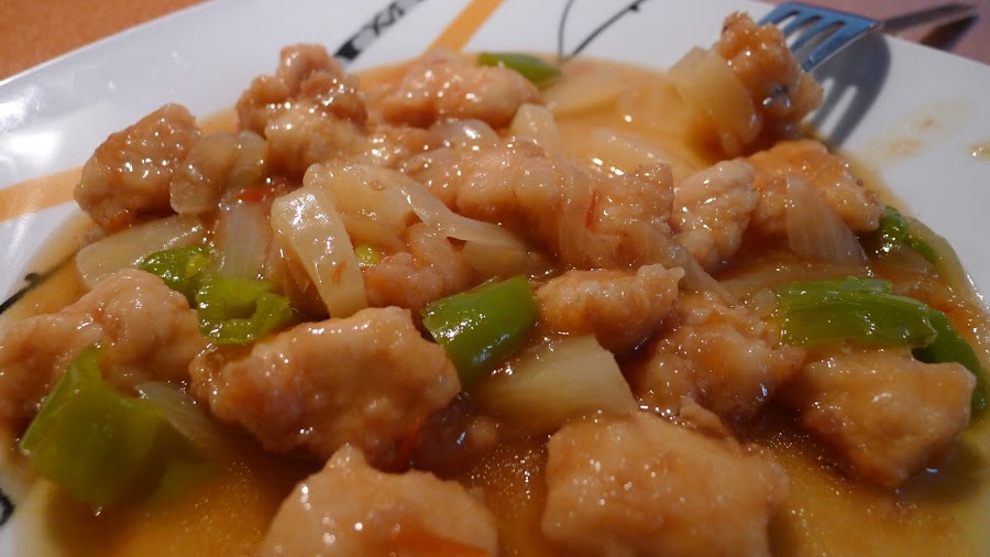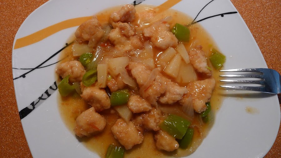 La idea la saque del blog El disfrutar del paladar,el cual acabo de descubrir y me parece estupendo,aunque yo,como casi siempre he puesto mi toque y lo he tuneado un poco... bastante.Mi salsa agridulce es casera,una invencion mia y para mi gusto ,todo un acierto:mermelada de tomate,jugo de la lata de piña,vinagre de manzana y agua....vamos para no parar de mojar pan en la salsita...pero se puede ser buen@, y contenerse y no pecar jeje.