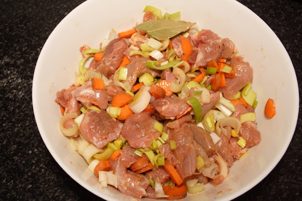 En un bol grande, ponemos el pavo, las zanahorias, el puerro, el laurel, el vino y el pimentón. Removemos y mezclamos bien todo, tapamos con film y metemos en el frigorífico durante toda la noche, para que se macere.