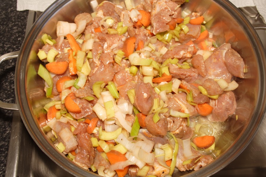 Salpimentamos el pavo y reservamos. Lavamos y troceamos las zanahorias y el puerro. Reservamos.