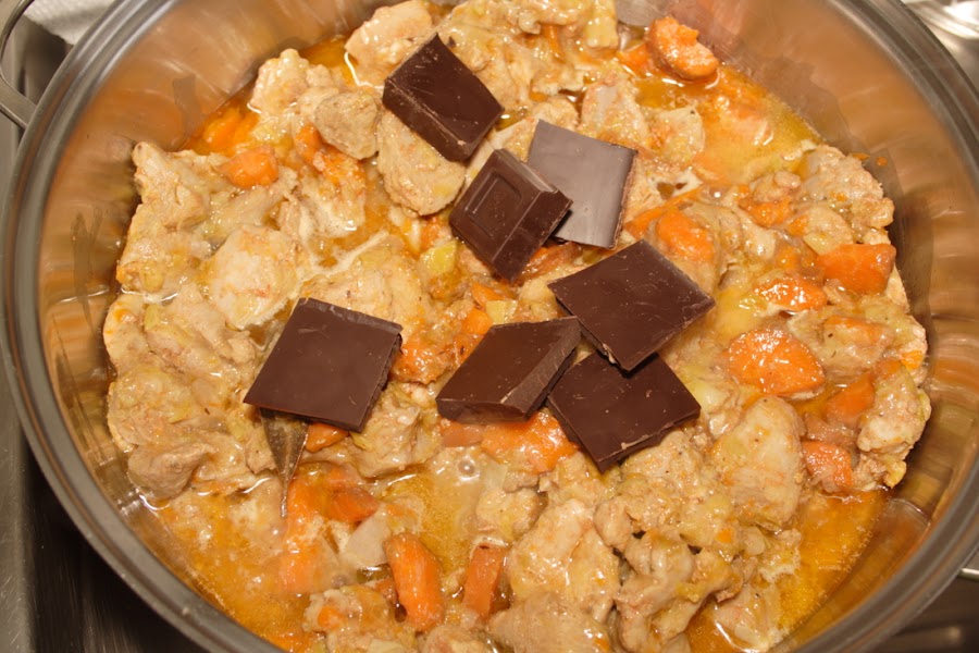Es entonces cuando troceamos el chocolate y lo añadimos al guiso. Removemos hasta que se funda el chocolate, dejamos cinco minutos para que se mezclen los sabores.