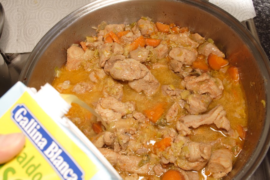 Dejamos que se vaya haciendo, removiendo de cuando en cuando, pasados otros 10 minutos añadimos el caldo de verduras, removemos y lo dejamos al fuego hasta que veamos que el pavo esta blando.
