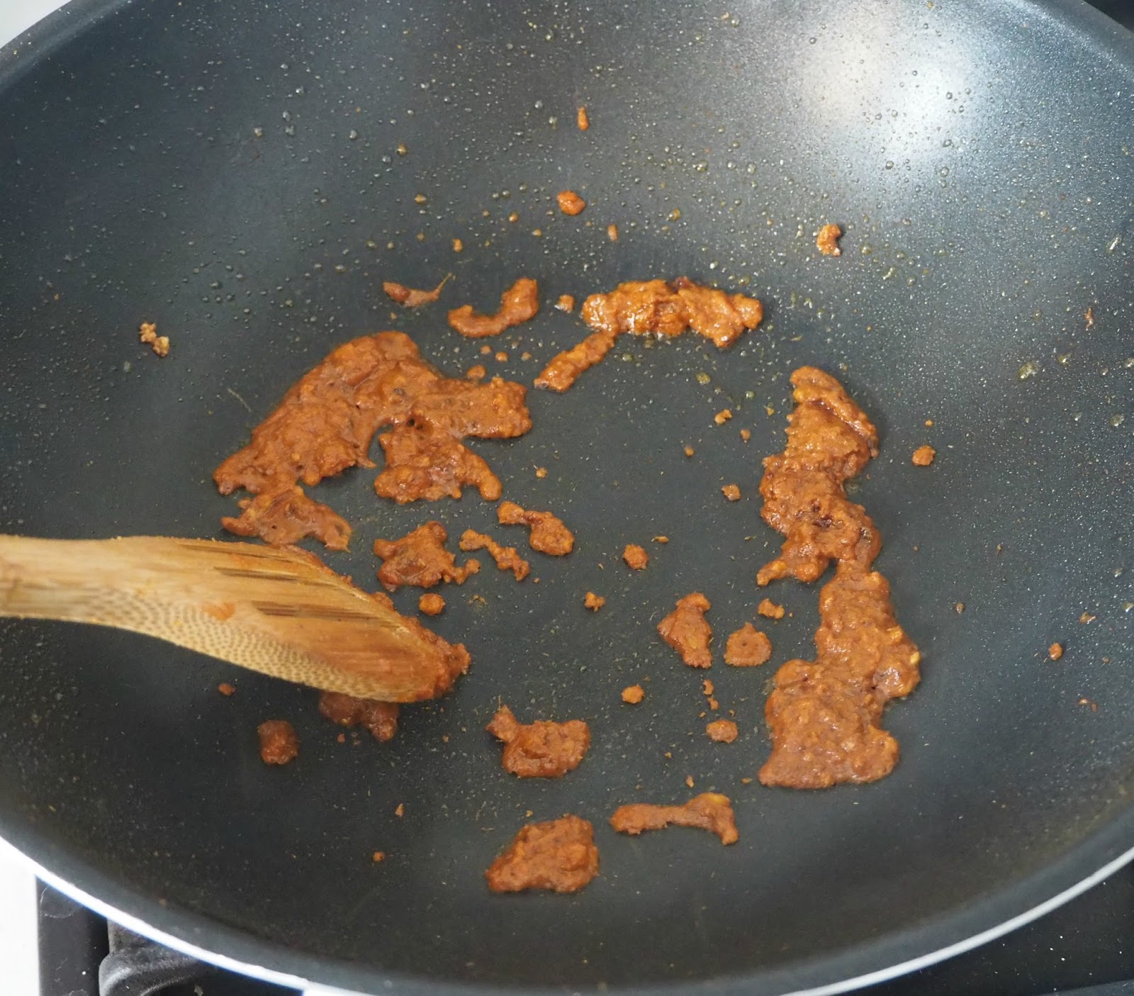 - A continuación, añadimos la pasta de curry y la vamos deshaciendo. podemos añadir un poquitín de agua para facilitar la tarea. Removemos constantemente para que no se queme.