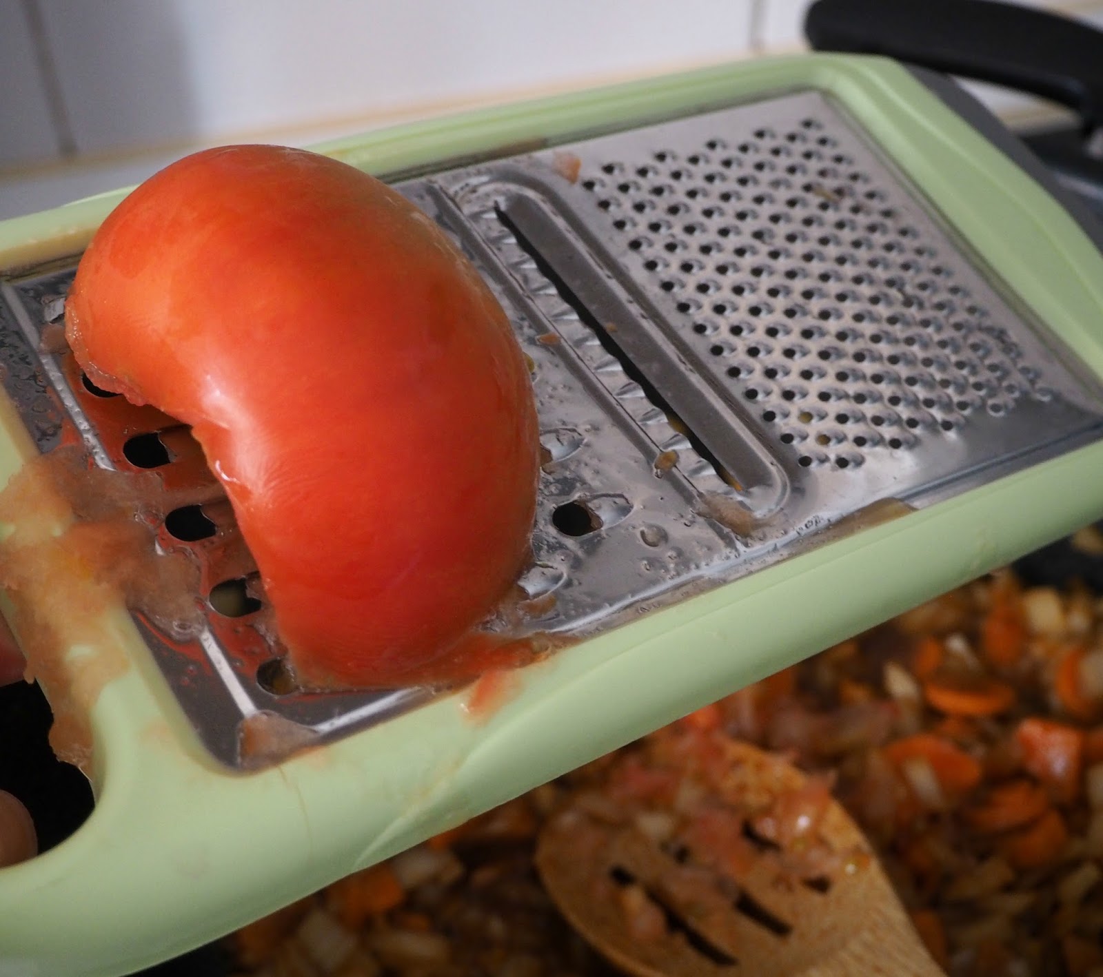 - Tras un par de minutos, añadimos el concentrado de tomate y el tomate, que rallaremos al momento, y removemos.