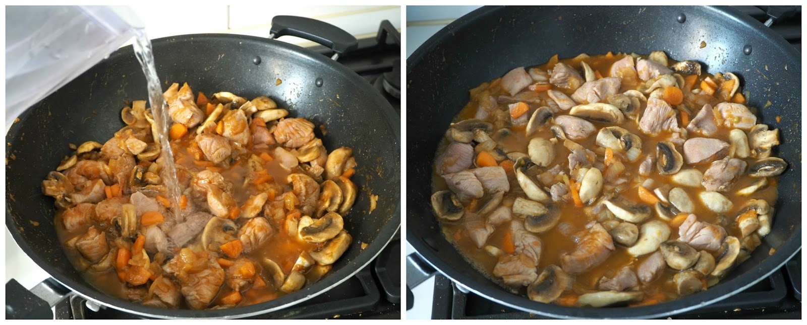 - Tras un par de minutos, añadimos el pavo y cubrimos, casi por completo, de agua. Dejamos que hierva, bajamos un poco el fuego y tapamos. Dejamos cocer hasta que veamos que tanto el pavo como las verduras están bien hechas y la salsa ligada (unos 10 minutos).