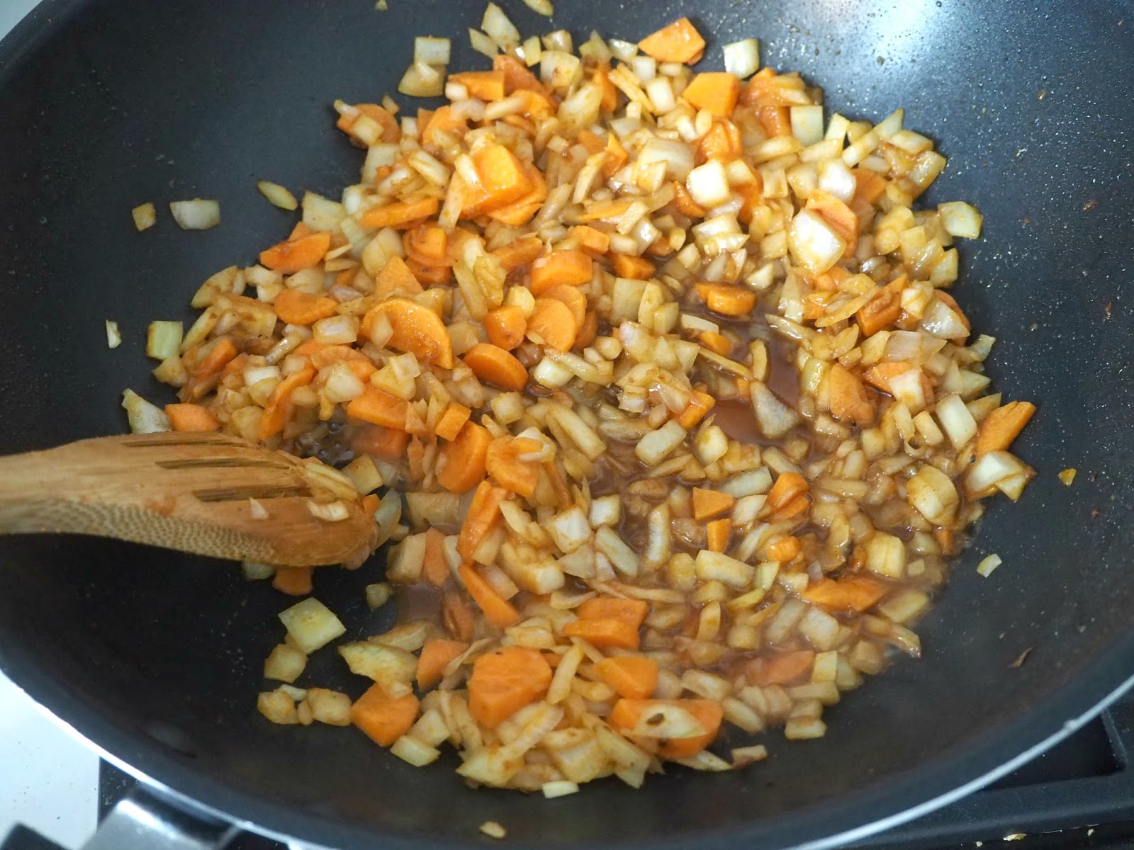 - Seguidamente añadimos la cebolla y las zanahorias picadas y empezamos a saltear hasta que se vayan quedando tiernas. Añadimos las salsa de soja y de pescado, removemos bien.