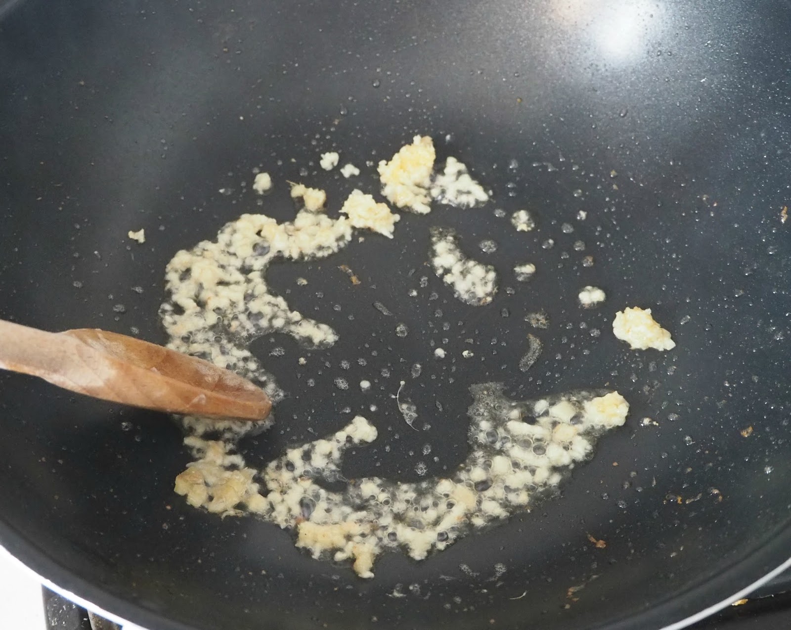 - Añadiendo algo más de aceite si hiciera falta, ponemos a dorar el ajo y el jengibre en el wok.