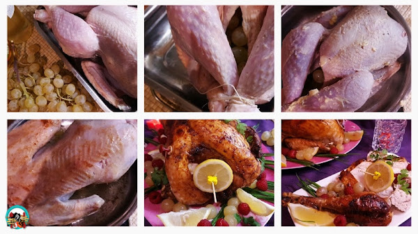 Consejo: Puedes macerar el pavo con la cerveza y el vino 2 horas antes de asarlo al horno, para que se quede más sabroso. El pavo lo hice con los ingredientes que tenía en casa. La misma receta la puedes hacer con cerezas, las añades a la fuentes las cocinas con el pavo, reservando algunas frescas para la decoración. Igualmente puedes decorar el pavo con otras hierbas frescas; salvia, hierbabuena o romero. El limón lo puedes sustituir por las naranjas.