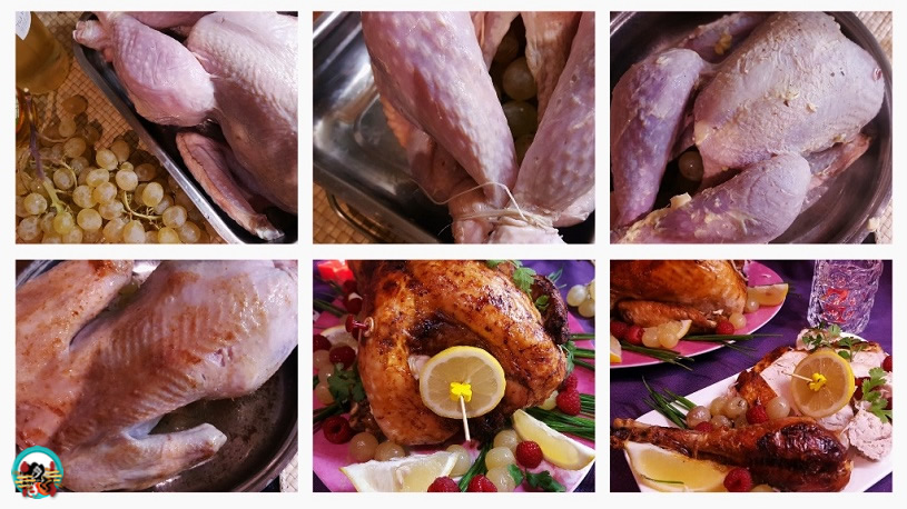 1.- Lavamos bien el pavo por dentro y por fuera, lo secamos con papel de cocina. Le quitamos las plumas sobrantes y lo ponemos en una fuente de horno. lavamos bien las uvas, las secamos y rellenamos el pavo con las uvas. Le atamos las patas con hilo de cocina. Lo untamos por fuera con mantequilla, en una caldero chato y grande ponemos un poco de aceite de oliva y doramos el pavo por todos los lados.