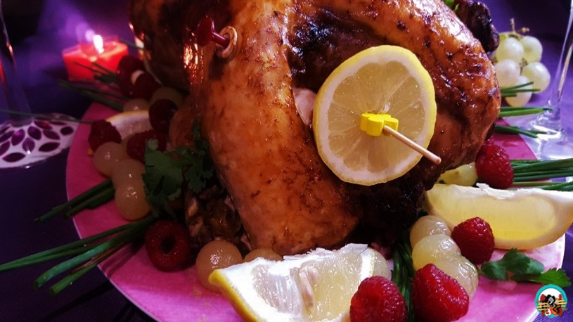 3.- Retiramos el pavo del horno. Lo ponemos en una bandeja y lo decoramos con las uvas del relleno, las frambuesas, los cebollinos, las hojas de cilantro y los limones. Servimos con el jugo que ha soltado durante la cocción.