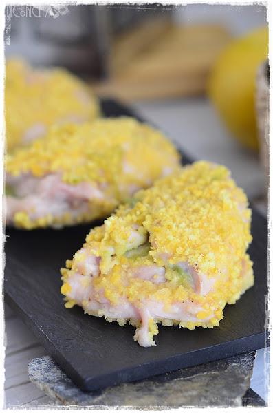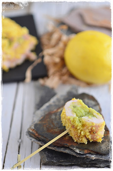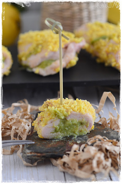 La preparación no hace falta que os explique, no?? estirar las pechugas, rellenar, y cerrar con hilo de cocina. Rebocé en huevo, y posteriormente en una mezcla que me vino en una cajita mensual, de la marca Flumel, que es un especial de limón para horno