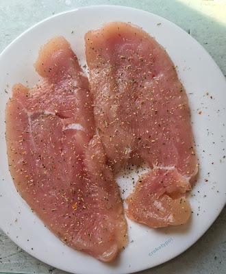 Nos ponemos el delantal.INGREDIENTES: 2 raciones: 2 Filetes de pavo, 1 patata grande, media cebolla, 1 tomate pera, un ajo, 50 ml vino blanco, mezcla hierbas aromáticas ( romero, tomillo, albahaca y chile) sal, pimienta negra y aove.