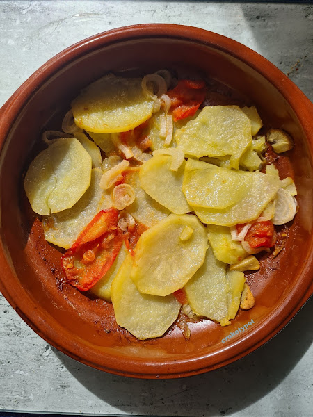 Pelamos la cebolla y las patatas se cortan en rodajas finas, al igual el tomate. Lo pondremos todo en una fuente de horno o en una cazuela, salpimentamos y le ponemos el ajo picado. Le ponemos el vino y aceite y lo ponemos en el horno precalentado a 200º , 20 minutos.